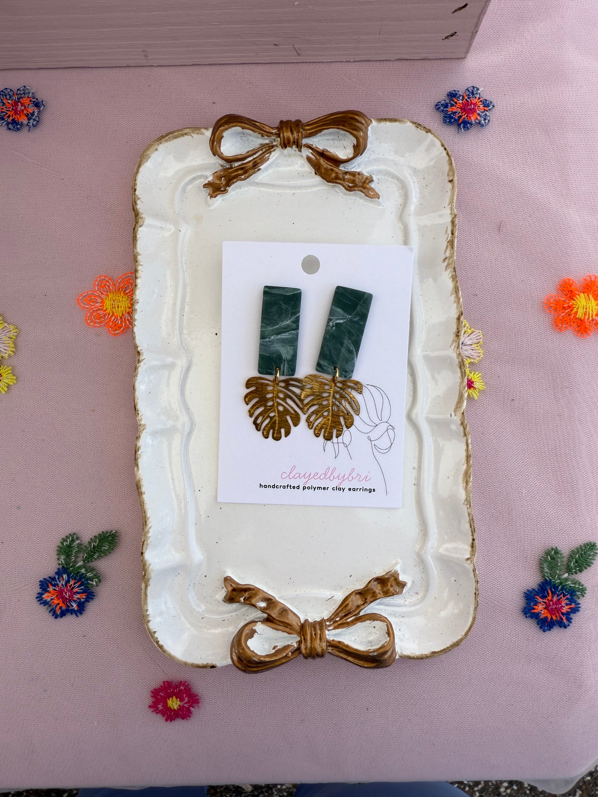 Green Marbled Earrings with Gold Monstera Leaf Charm